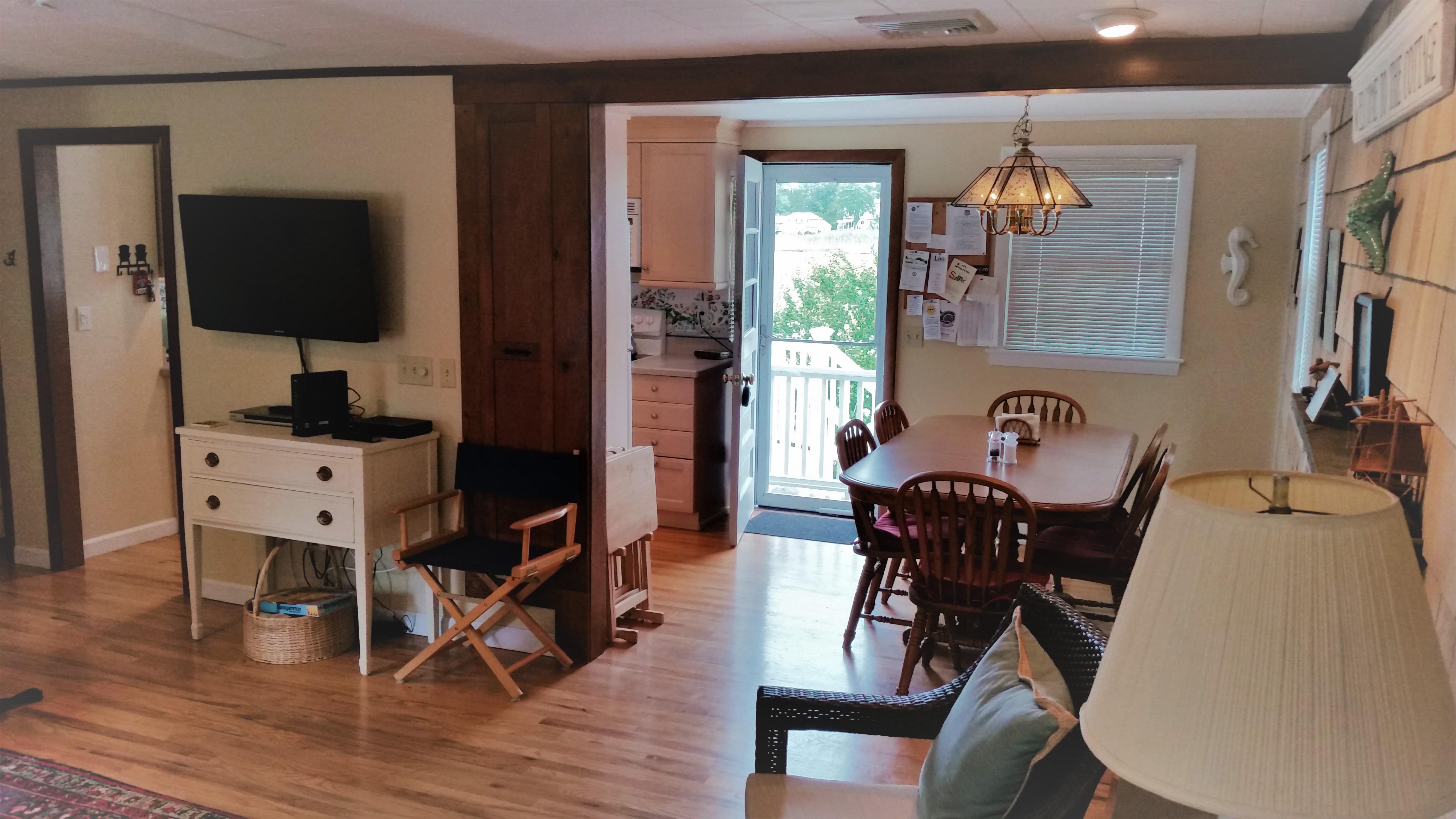 Table and chairs for 6 with additional leaf and 2 extra chairs in closet if needed for entertaining, conveniently located aside the kitchen and livingroom |