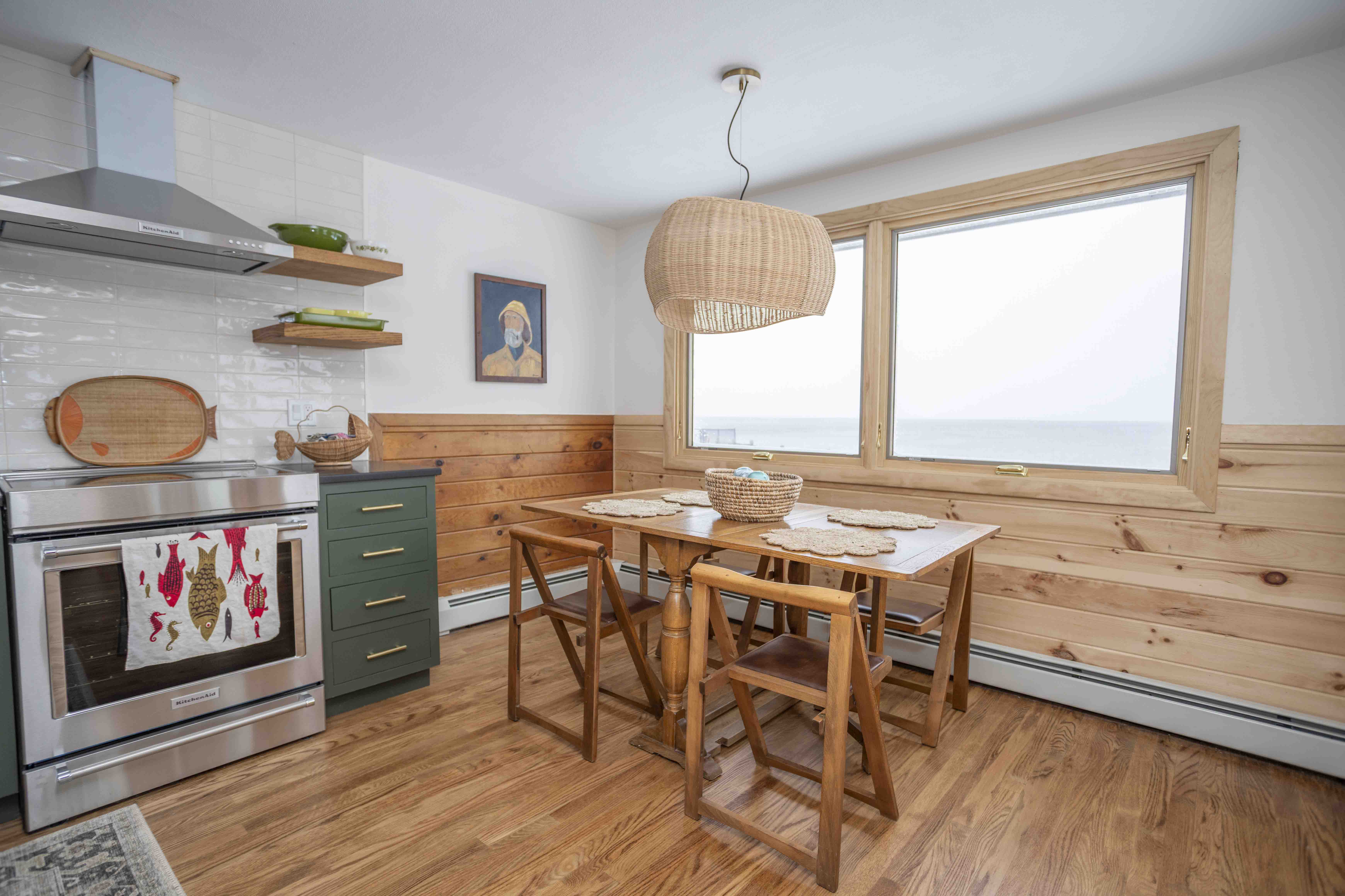 Dining table with 4 chairs overlooking the water view through a large window. |